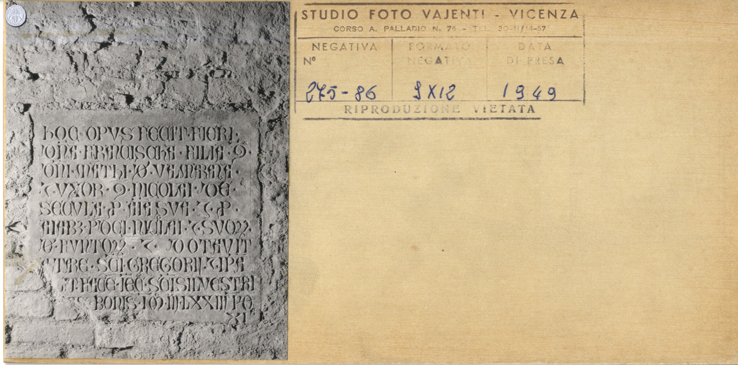 [Iscrizione medioevale in latino : Hoc opus fecit fiori domina Francischa filia domini Mathi de Valmarana et uxor cum Nicolai domine Secula pro anima sua et pro animarum predicti Nicolai et suorum defun[c]torum et dotavit altare Sancti Gregorii et ipsa [...] facere [...] Sancti Silvestri [...] bonis in 1373 1. de 11. f.] /Studio foto Vajenti