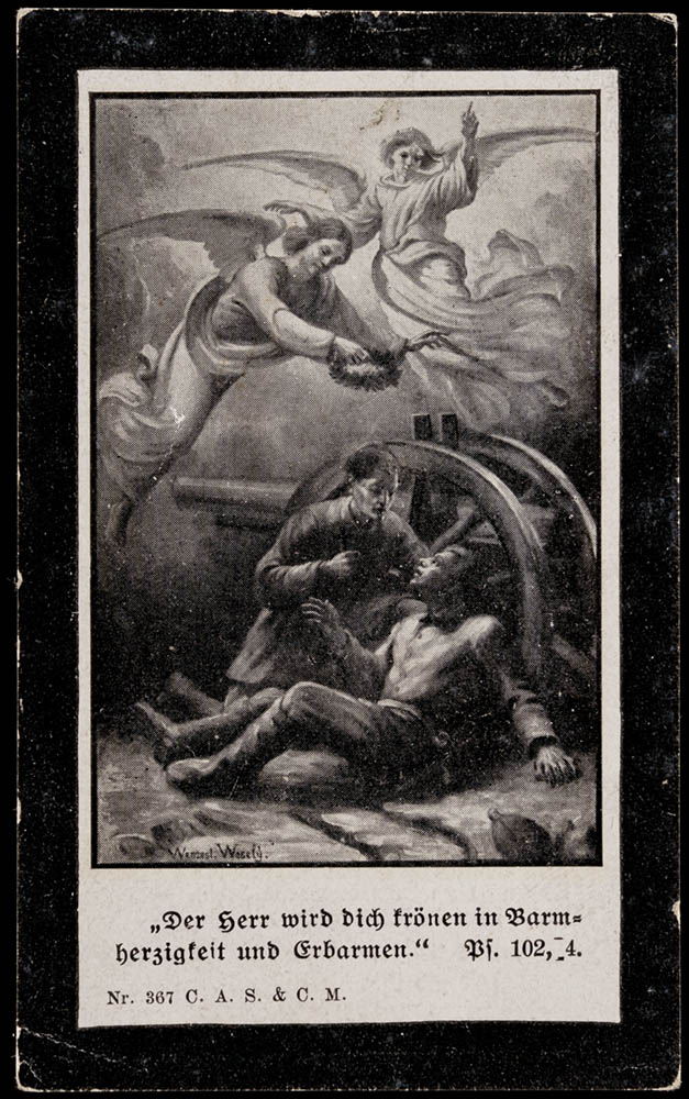 Luttino militare contornato da un listino nero, raffigurante due angeli in volo, di cui uno tiene in mano una corona di alloro, mentre scendono verso due soldati sul campo di battaglia. Un soldato è inginocchiato accanto all'atro soldato e tiene in mano un crocifisso. Nell'immagine in basso: We? Wesely